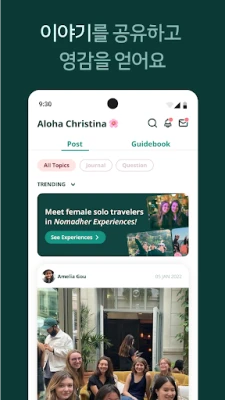 노매드헐은 전 세계 여성 여행자들의 살아있는 이야기를 실시간으로 들려줍니다. 어디를 가든 당신과 뜻을 함께할 동반자를 쉽게 찾을 수 있도록, 앱 내 메신저 기능을 통해 안전하고 편리하게 소통하세요. 국경을 넘어 우정을 나누고, 여행의 지혜를 공유하며 더욱 풍성한 경험을 만들어 갈 수 있습니다. 또한, 워크숍부터 페스티벌, 온라인 모임까지 다채로운 이벤트에 참여하며 특별한 추억을 쌓을 기회를 만나보세요.