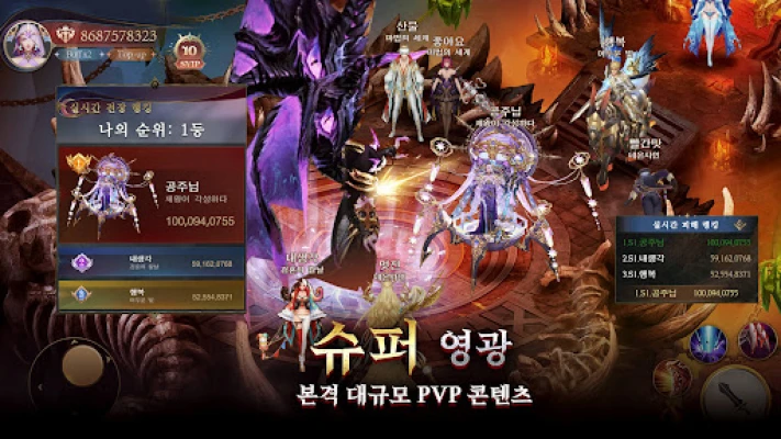 수많은 영웅들이 맞서는 치열한 혈투장에서 당신의 진정한 가치를 증명하십시오. 최대 천 명의 전사가 동시에 격돌하는 압도적인 규모의 전장에서 실시간 PVP의 스릴을 만끽하며 영원한 명성을 쟁취하세요. 당신의 승리의 함성은 대지를 흔들고, 모두에게 기억될 영웅의 서사시를 써 내려갈 것입니다. 아낌없이 쏟아지는 황금빛 혜택 또한 당신의 여정을 더욱 빛나게 할 것입니다.