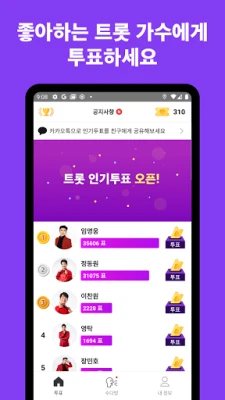 트롯 팬들을 위한 필수 앱! 좋아하는 트롯 가수에게 투표하고 실시간 인기 순위를 확인해 보세요. 팬들이 함께 만들어 가는 K-트롯 스타 랭킹으로, 누가 가장 인기 있는지 지금 바로 만나보세요.