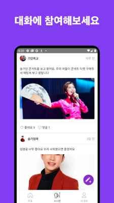 이 활기찬 커뮤니티에서는 더 이상 혼자가 아닙니다. 좋아하는 트롯 가수에 대한 이야기, 잊지 못할 명곡에 얽힌 추억, 그리고 최신 트롯 소식까지. 그 어떤 이야기라도 환영받는 분위기 속에서 자유롭게 대화를 나눌 수 있습니다. 서로의 인사와 함께 트롯으로 시작되는 다채로운 수다가 여러분을 기다립니다. 깊이 있는 교류를 통해 새로운 인연을 맺고, 트롯의 세계를 더욱 풍성하고 즐겁게 경험해 보세요.