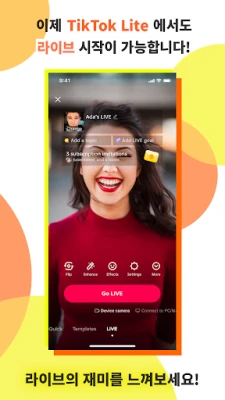 실시간 소통의 즐거움이 가득한 세상, TikTok Lite에서 지금 바로 경험해보세요. 직접 당신의 이야기를 방송하거나, 흥미로운 라이브에 게스트로 참여하여 전 세계와 연결될 수 있습니다. 출퇴근길, 쉬는 시간, 점심시간, 잠들기 전 등 언제 어디서든 가볍게 즐길 수 있는 특별한 재미가 당신을 기다립니다.